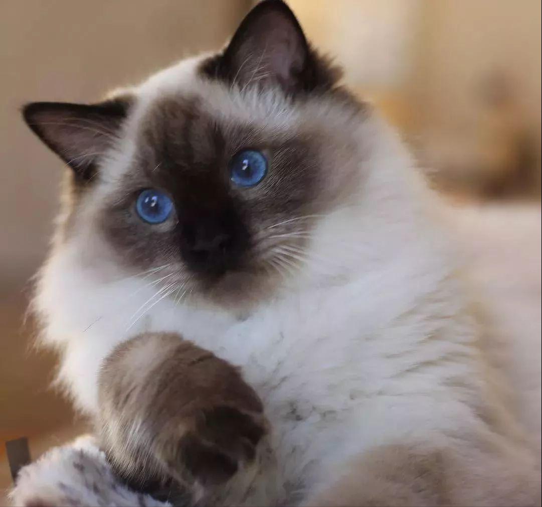 2、看眼睛。布偶猫的眼睛是杏仁形的,颜色为深蓝色,看起来很深邃、很漂亮、很神秘。