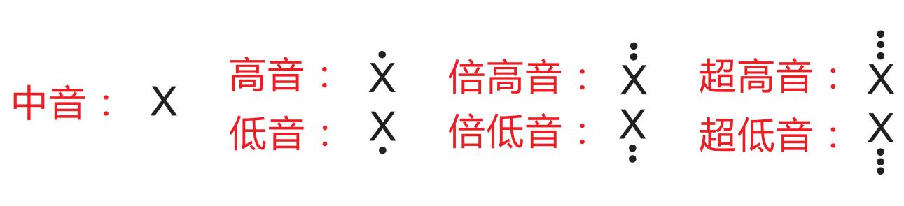 如图,在简谱中不带点的基本符号叫做中音;在基本符号上方加一个点叫高音,加两个点叫倍高音,加三个点叫超高音;在基本符号下方加一个点叫低音,加两个点叫倍低音,加三个点叫超低音。