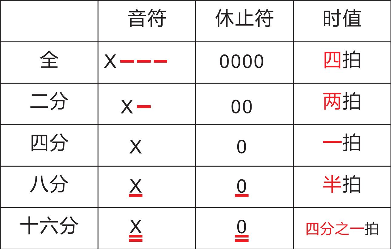 这里怕新手不太懂,解释一下,拍子的时值是个相对的时间概念,例如当歌曲的规定速度为每分钟60拍时,每拍占用的时间是一秒,那么半拍就是二分之一秒;当歌曲的规定速度为每分钟120拍时,每拍的时间就是二分之一秒,半拍就是四分之一秒,依此类推。