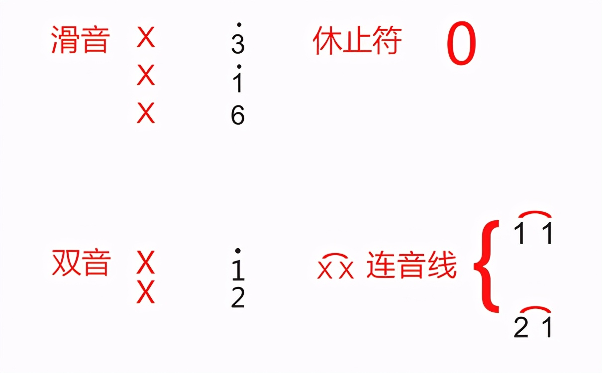 休止符:休止符在曲谱上就是“0”这个数字,当出现0这个数字时,则表示该拍为空拍,不需要弹奏。