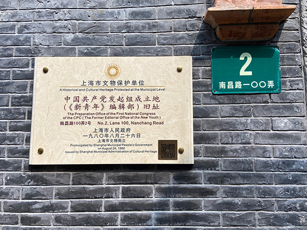 中国共产党发起组成立地(《新青年》编辑部)旧址标牌。澎湃新闻记者 陈悦 图