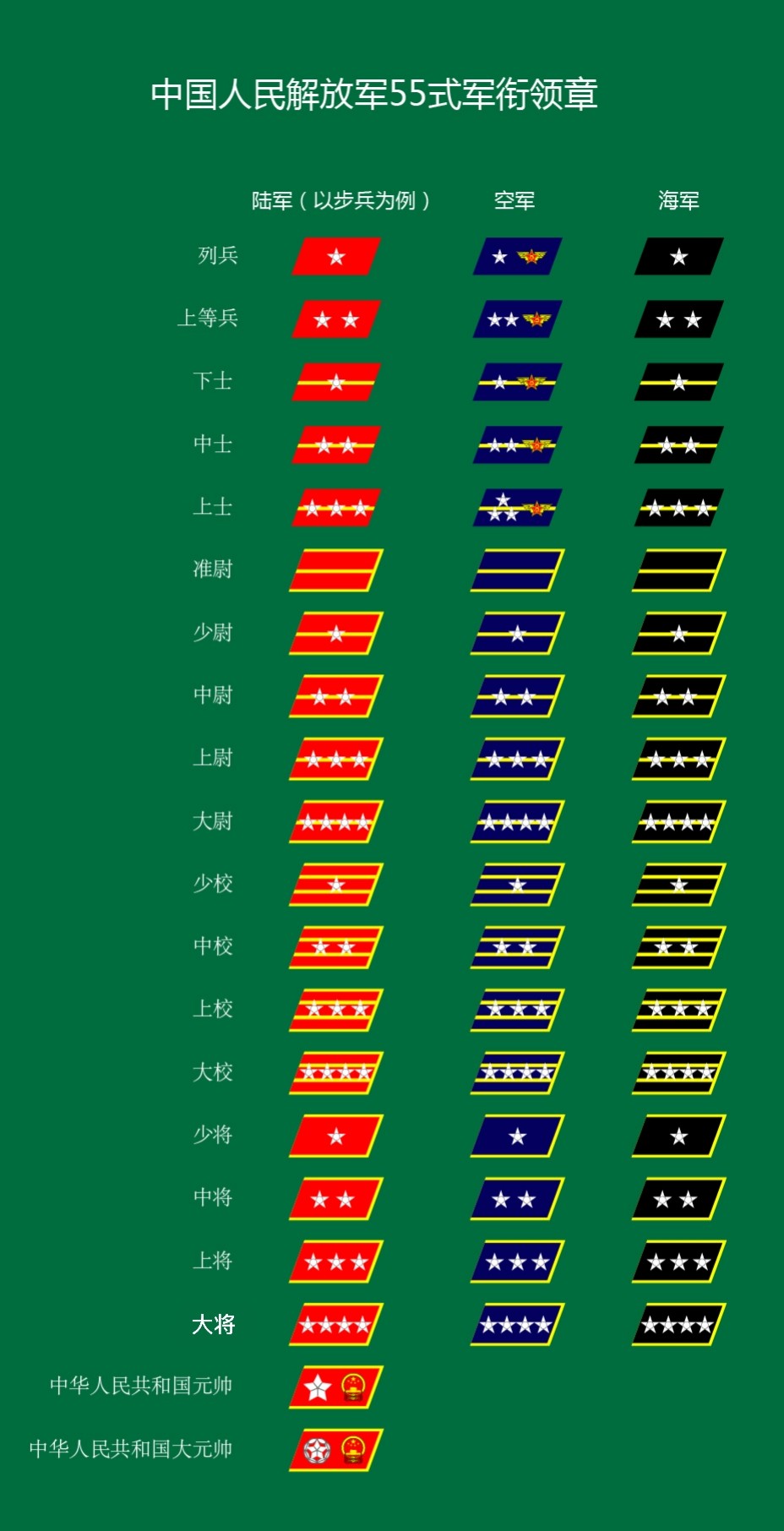 新中国成立之后,中国人民解放军在1955年首次实行军衔制,此次军衔分为6段20衔,元帅包括中华人民共和国大元帅和中华人民共和国元帅,将官分为,大将,上将,中将,少将,校官分为大校,上校,中校,少校,尉官分为,大尉,上尉,中尉,少尉,士官和兵分为,上士,中士,下士,上等兵和列兵,其中陆军士兵领章按照不同的兵种加装不同的标志予以区分。例如空军士兵的领章除了星之外,还带有空军军徽