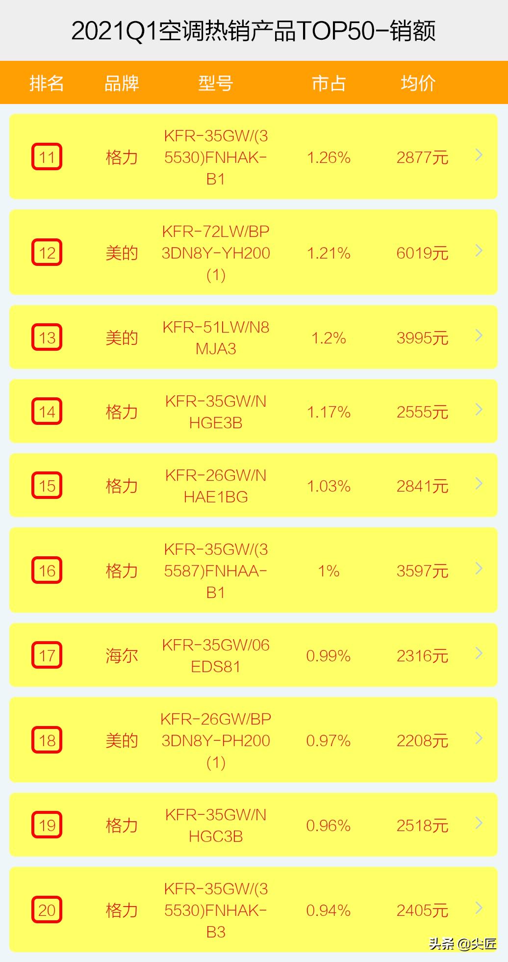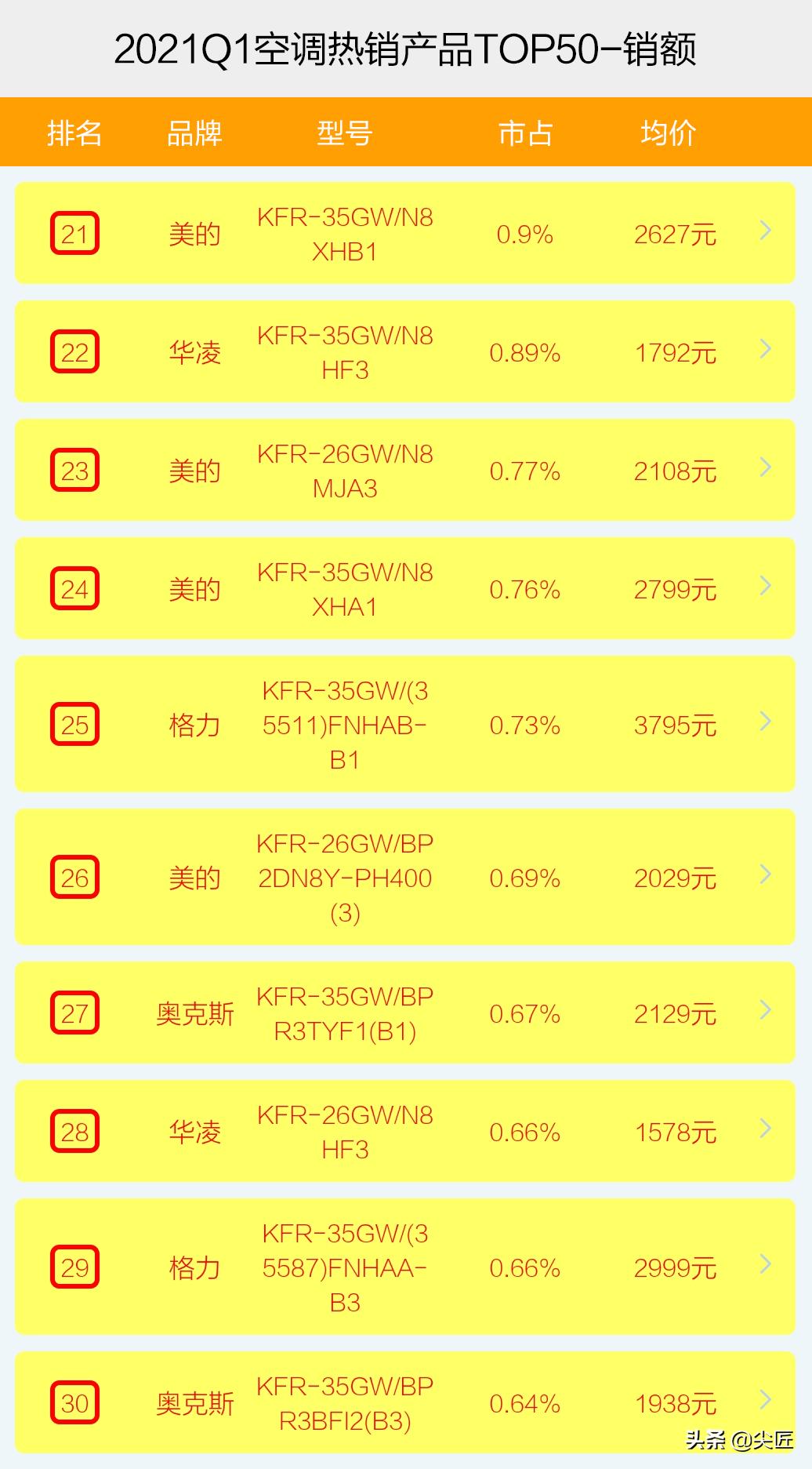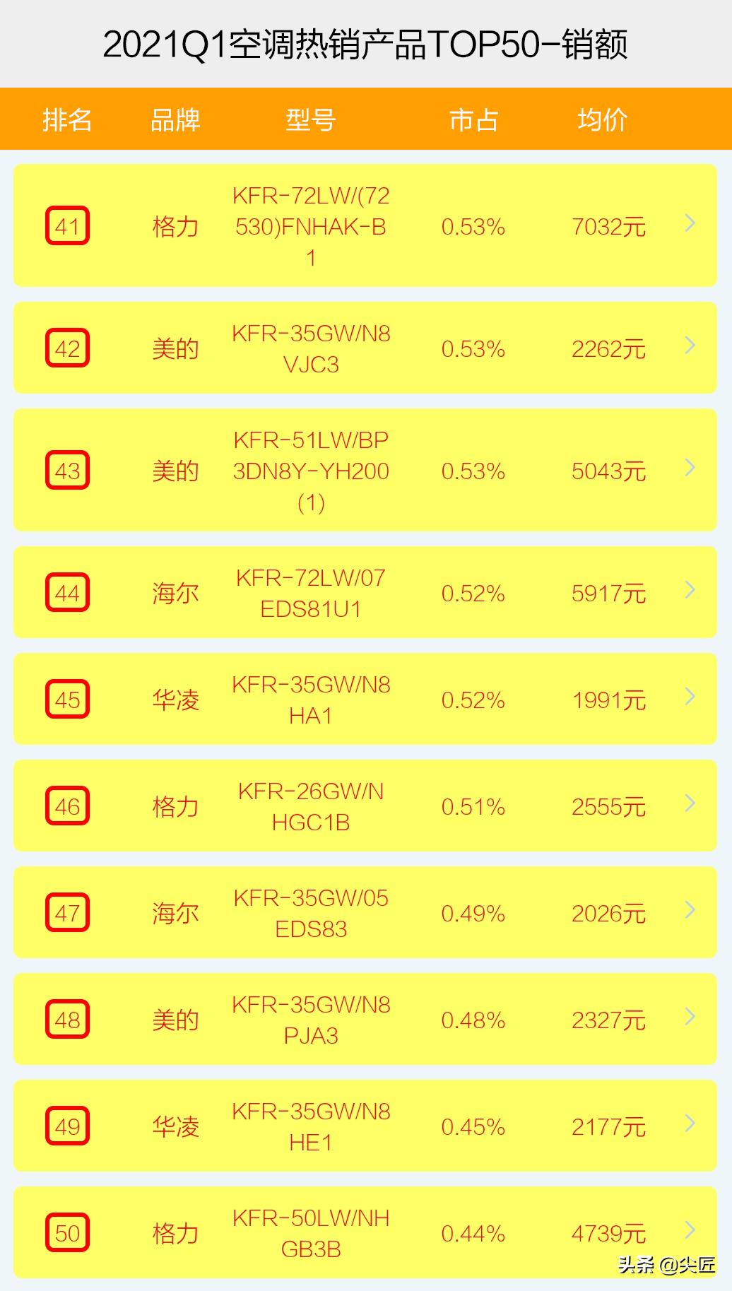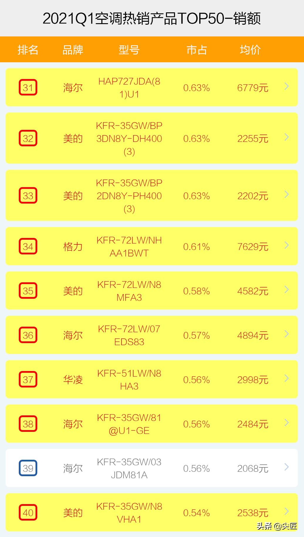 2021年一季度,空调销售额TOP50热销机型数量,全部被前5大品牌瓜分,美的上榜19个,格力17个、海尔7个、华凌5个、奥克斯2个,而且,除了海尔一款机型是老品外,其余49款机型全部是新品。