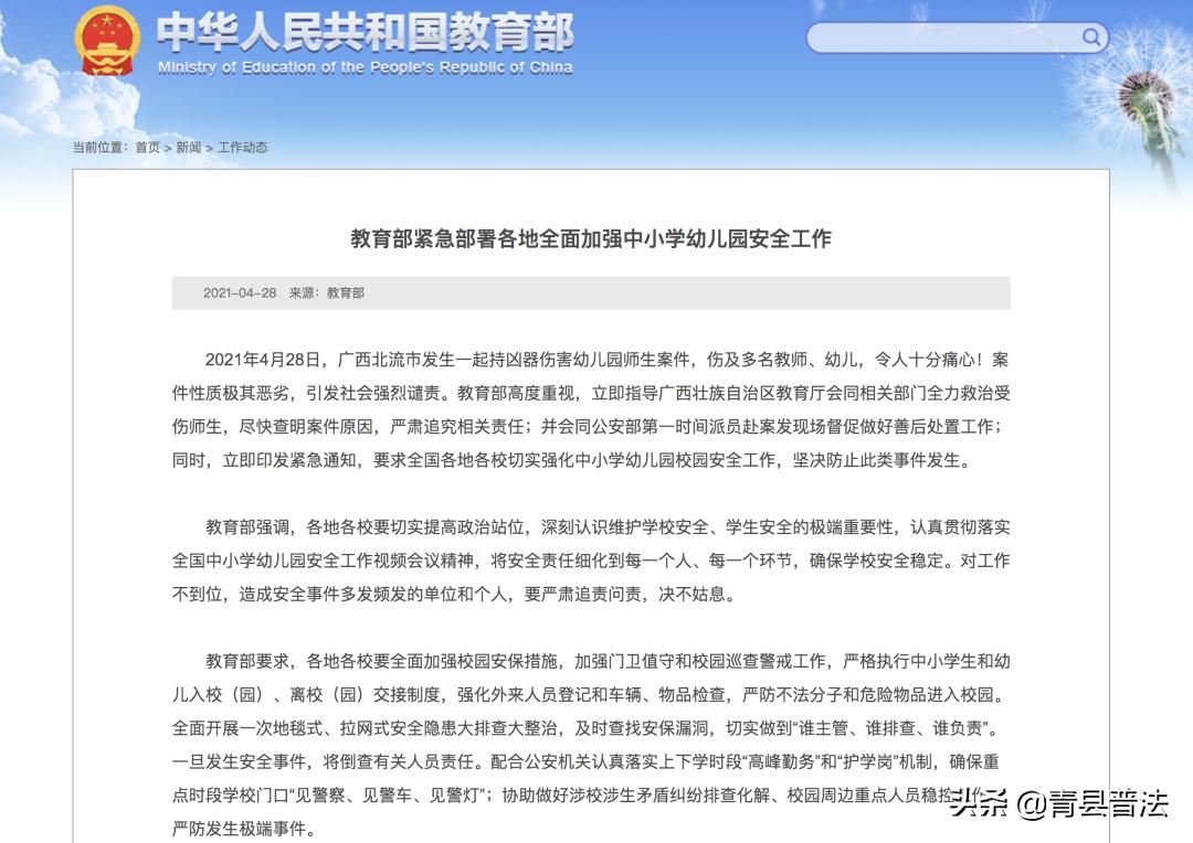 在广西北流持凶伤害幼儿园师生案件发生后,教育部紧急部署:①要求校园强化外来人员登记检查,严防不法分子和危险物品进入校园;②全面开展地毯式、拉网式安全隐患大排查大整治;③重点时段学校门口“见警察、见警车、见警灯”。