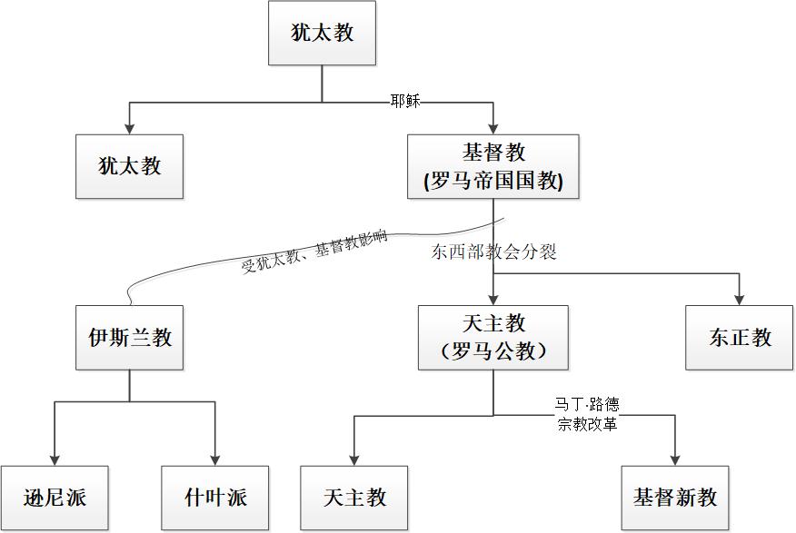 基督教—(罗马帝国东西部教会分裂)—>天主教(罗马公教)+东正教;