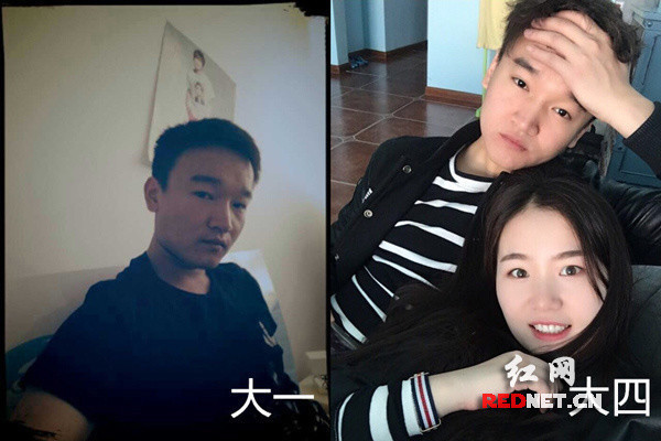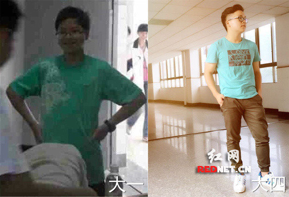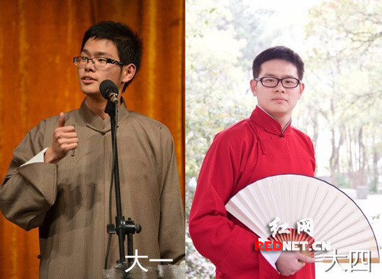 来自中南大学学生会的赵甜甜是负责收集这些对比照的主要人员之一,当她看到学姐学长发给学生会的图片时觉得很惊艳,大学四年的生活带给同学们太多的改变,学校就像个美容院,她希望自己从学生会卸任后,要好好学习生活,希望大四时也可以像晒照的学长学姐们那样,登上照片墙,“惊艳”四座。图为吴为铮,四年里外貌变了不少,唯一不变的是他对相声艺术的热爱。