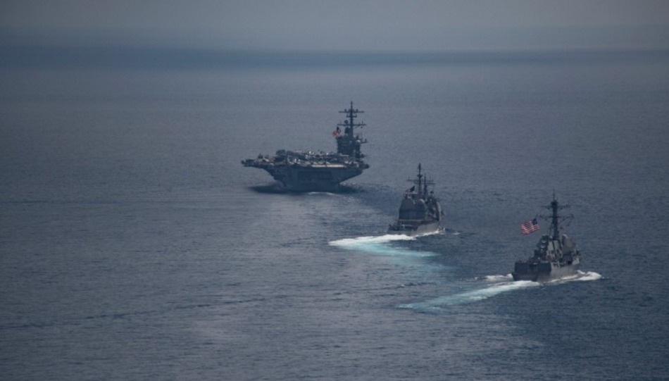 4月14日在印度洋上的"卡尔·文森"号、导弹驱逐舰USS Michael Murphy和导弹巡洋舰USS Lake Champlain