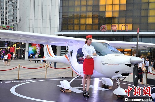 资料图:一辆私人飞机与一名"空姐"亮相福州某商场门口。中新社发 吕明 摄