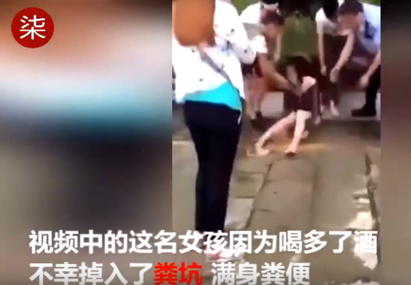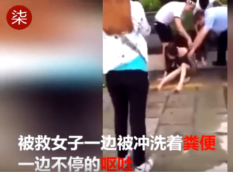 日前,一位女子因为酒醉掉入粪坑,满身粪便,被救起后,不同的呕吐,路人用水不停的为期冲洗身上的粪便。