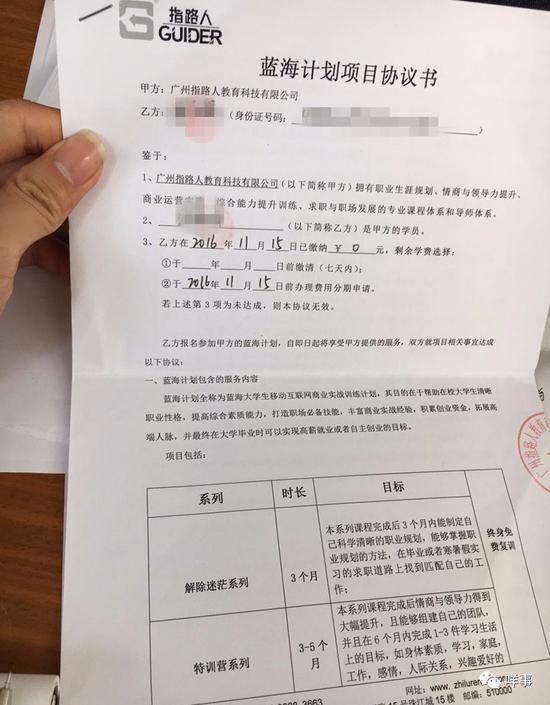 小英称,她犹豫时,工作人员对她说,"蓝海计划"仅有50个名额,如果需要考虑的话,得拿出100元作为名额保留费用。多名学生向南都记者提及,指路人公司的工作人员在介绍时都称项目机会难得。