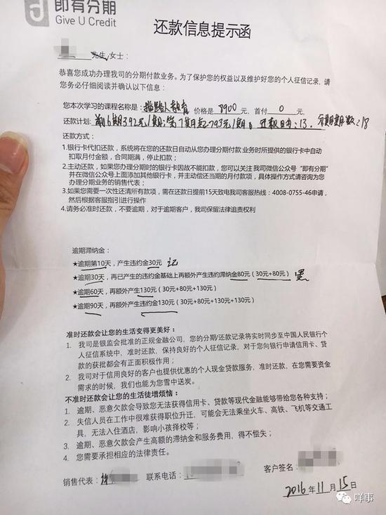 去年11月15日,小英再次来到指路人公司,完成一份贷款合同和《蓝海计划项目协议书》的签订。协议书显示,小英学习费用选择为分期付款,由第三方金融机构"即有分期"代为支付,分期数为18个月,前6个月每月还款为392元,后12个月每月还款为793元。如此计算下,小英此次的贷款总金额过万元。