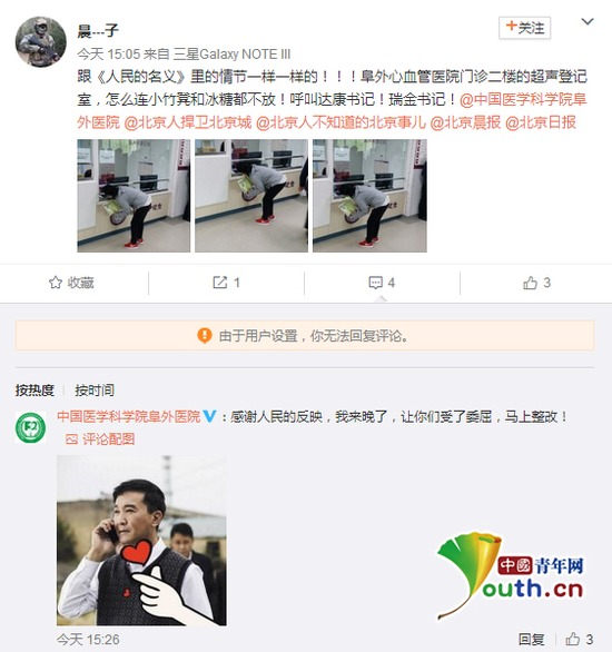 中国青年网北京4月21日电(记者 宋继祥)4月20日,一位网友在微博中称:"阜外心血管医院门诊二楼的超声登记室跟《人民的名义》里的情节一样一样的!呼叫达康书记!瑞金书记!"过了20分钟左右,中国医学科学院阜外医院官微便在该微博下面回复:"感谢人民的反映,我来晚了,让你们受了委屈,马上整改!"并配了一张网红"达康书记"的表情包。