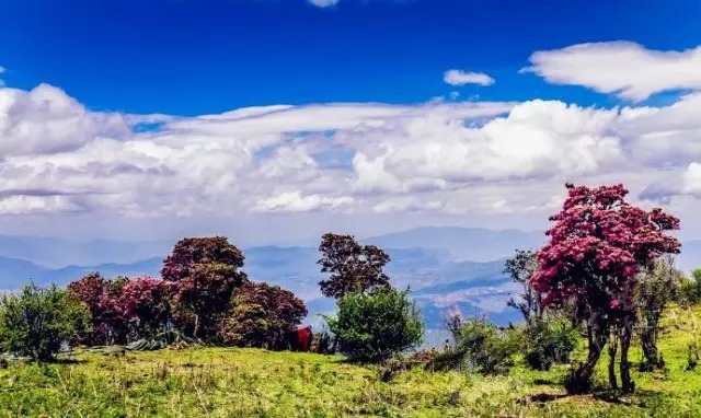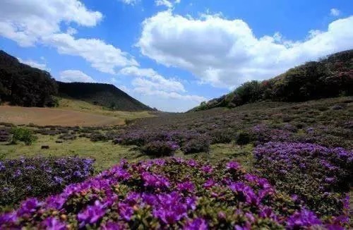 坐标:云南大理白族自治州境内,鹤庆县与洱源县交界处。从下关沿大丽路行走72公里,即军马场坡爬通后约1.5公里向左岔,再沿风电场主线行走57公里到达杜鹃花海腹地。