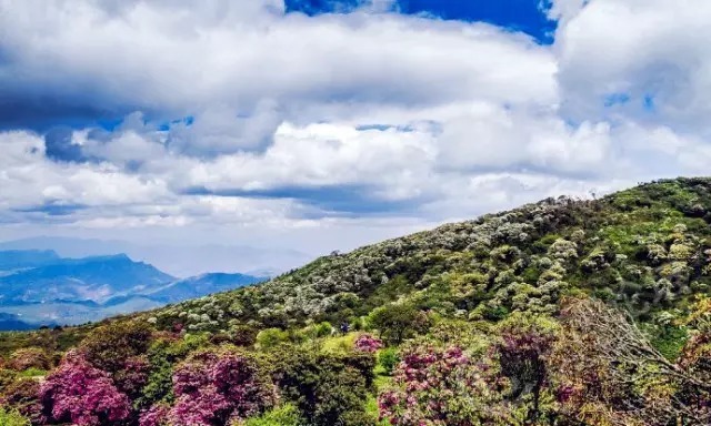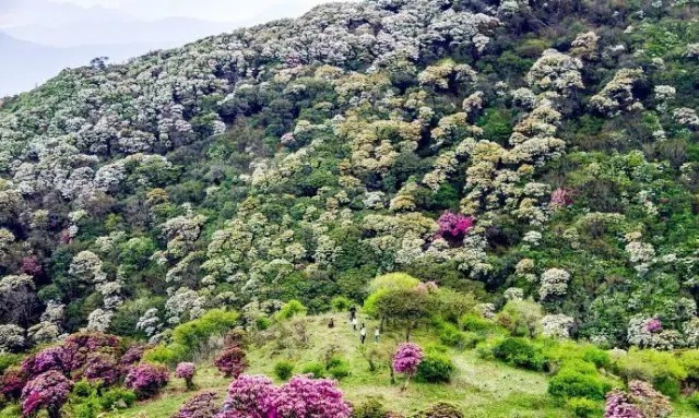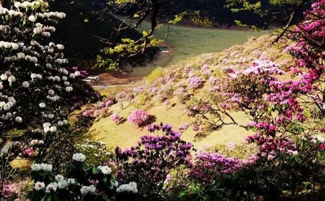 红的如霞,白的洁白,紫的靓丽。一片片、一丛丛,漫山遍野,铺天盖地, 远看似五色地毯从天际飞来,近观则古木苍天,花团锦簇, 花开成海,如梦似幻!
