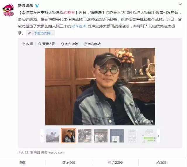 扮演过张三丰的武打明星李连杰发声支持太极再战徐晓冬