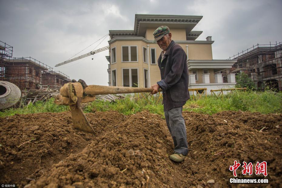 别墅南大门一侧住着一位看门老大爷,大爷姓高,安徽阜阳人,今年已经75岁。南大门由高大爷独自一人看守。据了解,高大爷已经这里看门7年。项目停工后,高大爷的任务是看守建筑器材,每个月可以领到1800元钱。平日里,高大爷在别墅区开垦了一片荒地,种些蔬菜;他唯一的伙伴就是一条小土狗。