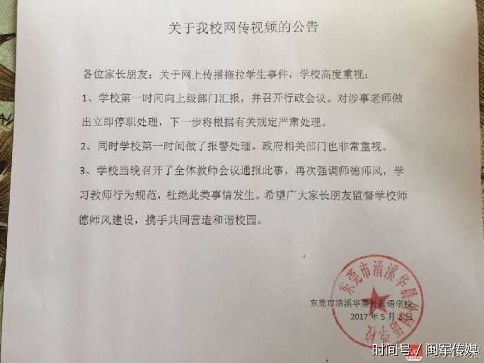 昨夜,清溪镇宣传教育办公室对此事进行通报称:5月2日13:30左右,一段老师拖拽学生的视频在微信朋友圈传播。经查,视频反映的事件发生在清溪华晨外国语学校门口,时间5月2日12:30左右,视频时长约1分钟。