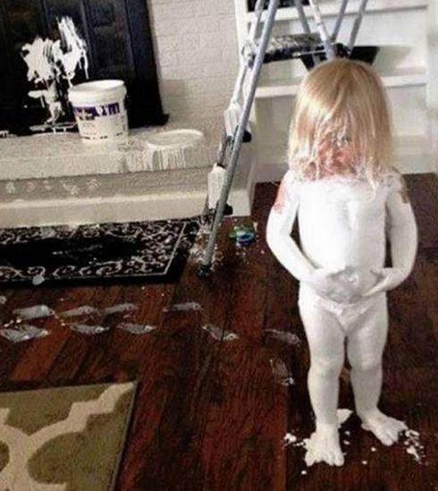 这个孩子,是不是太爱美啦?家里请了油漆工粉刷墙面,翻新一下屋子,可这油漆工叔叔仅仅就离开几分钟而已,她就把油漆粉刷自己了。有点像机器人,也有点像外星的,让人我笑趴了。