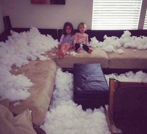 这个幸福的家庭,看来不幸福了啊。这两淘气的双胞胎姐妹啊,该说你们什么好呢?那可是上好的棉被啊,给你们这么一折腾,哪还有棉袄?一会儿,妈妈多外面回来,不气得半死才怪!