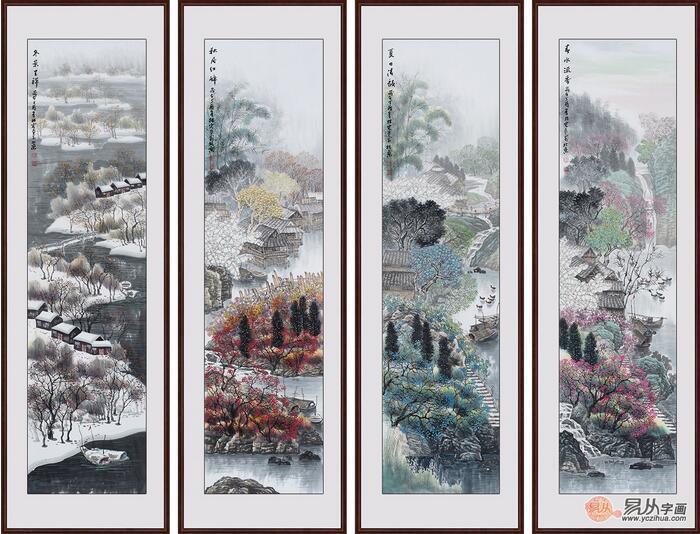 四条屏在书画中是一种别样的形式展现,但却极具美感的存在。其次“四”这一量词无论是古还是今都是用处颇广,“春夏秋冬”四季条屏更是以以大气磅礴的艺术笔法,展现四季山水的灵秀俊美。