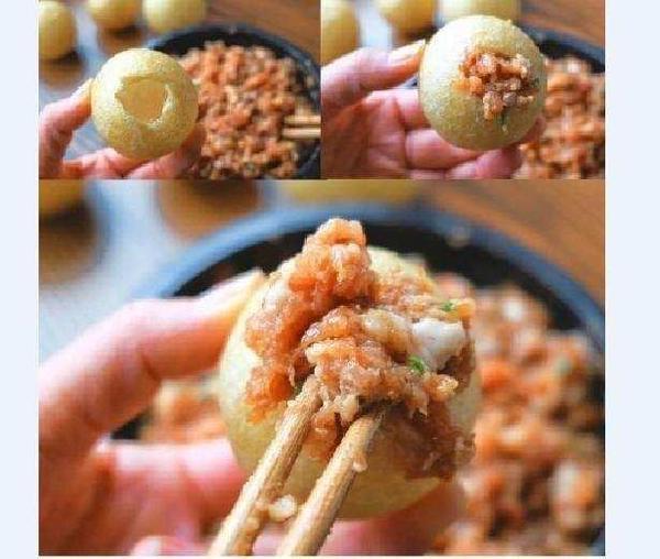 3、面筋的内部并不是空的,所有要用筷子“捣”一下,才能顺利塞进肉糜。