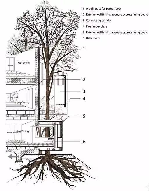 他最终在这个寸土寸金的地区建造了名为"林舞鸟鸣"(Dancingtrees, Singing birds)的住宅,让大树和房屋完美地结合在一起。