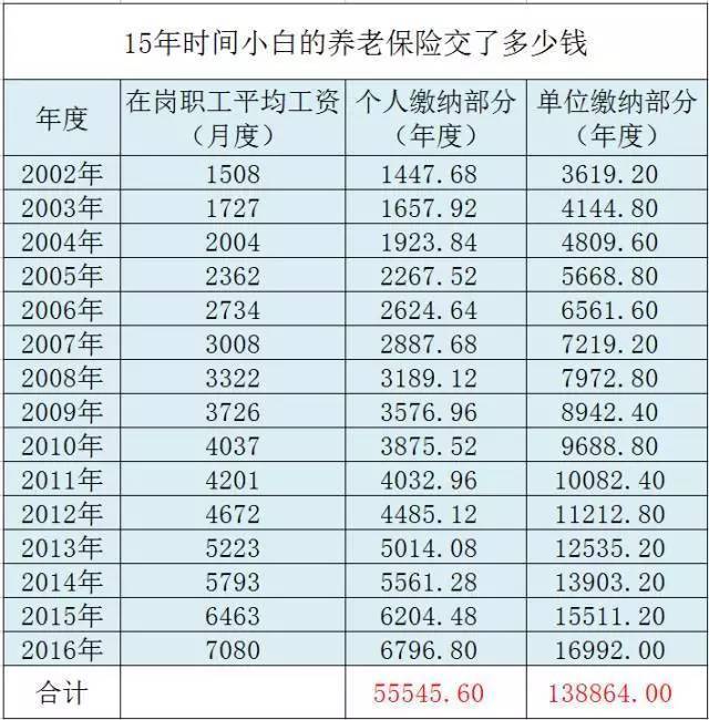 实际上,2002-2016年小白自己一共交了55545.60元,单位交了138864.00元,二者相加接近20万。