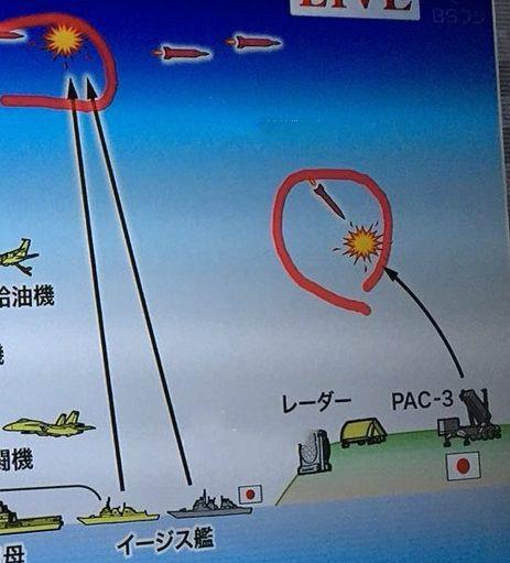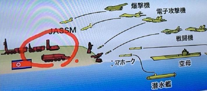 日本军事节目中出现的美国和日本联合打击朝鲜弹道导弹发射装置及对朝鲜弹道导弹防御的概念图。