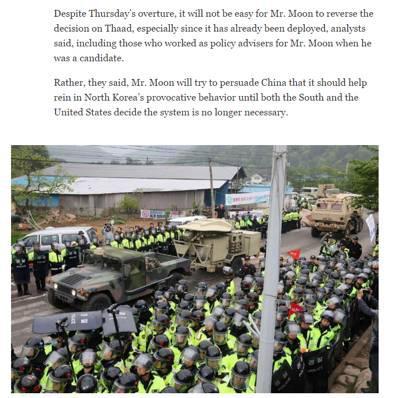 其次,美国《纽约时报》今天的一篇文章还点出了一个很尴尬的问题:由于萨德系统已经运抵了韩国,并且已经到达了原计划的部署地星州郡,所以即便是文在寅和他的新政府,也很难让美国人把设备再运回美国。