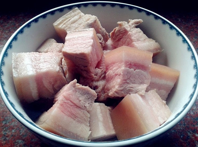 标准的三线五花肉一块!加花椒,姜片煮10多分钟,捞出切块。我切得比较大砣,这样吃带劲!
