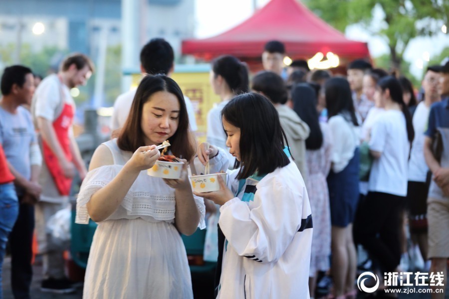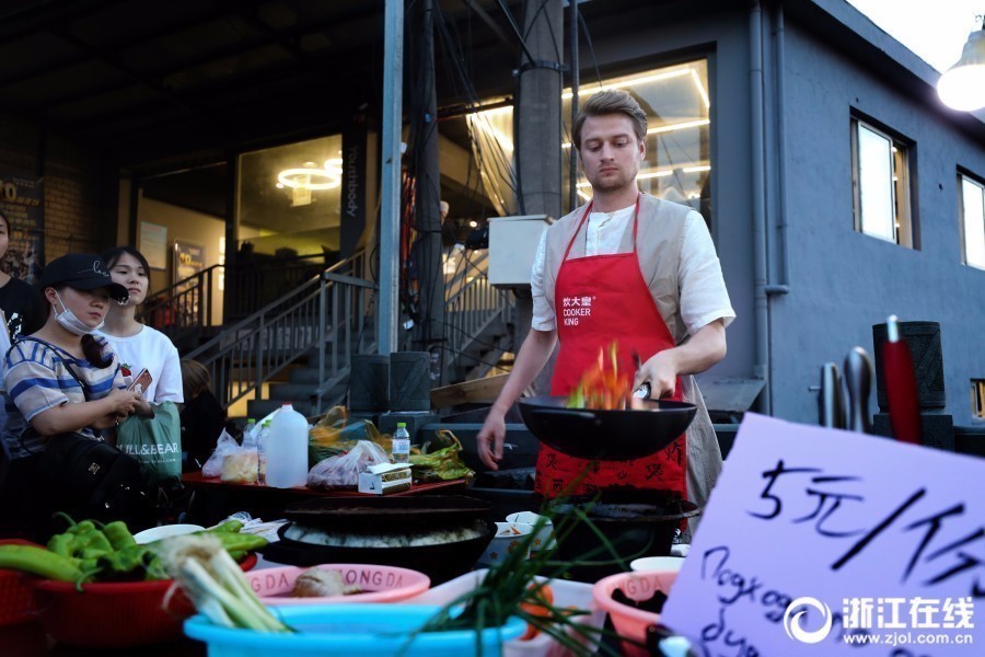 5月13日傍晚,杭州萧山区耕文路,美食档口上5元一份的鱼香肉丝人气火爆。热闹的夜宵摊后,大厨居然是一名金发蓝眼的洋小伙。