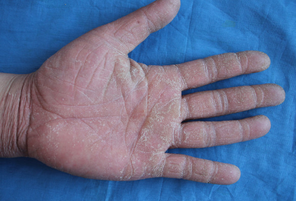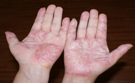 3、鳞屑角化型 足底、掌心、手足侧缘处可见角化过度、脱屑,微痒或不痒。冬季易发生裂口引起疼痛,裂口处亦可发生感染。