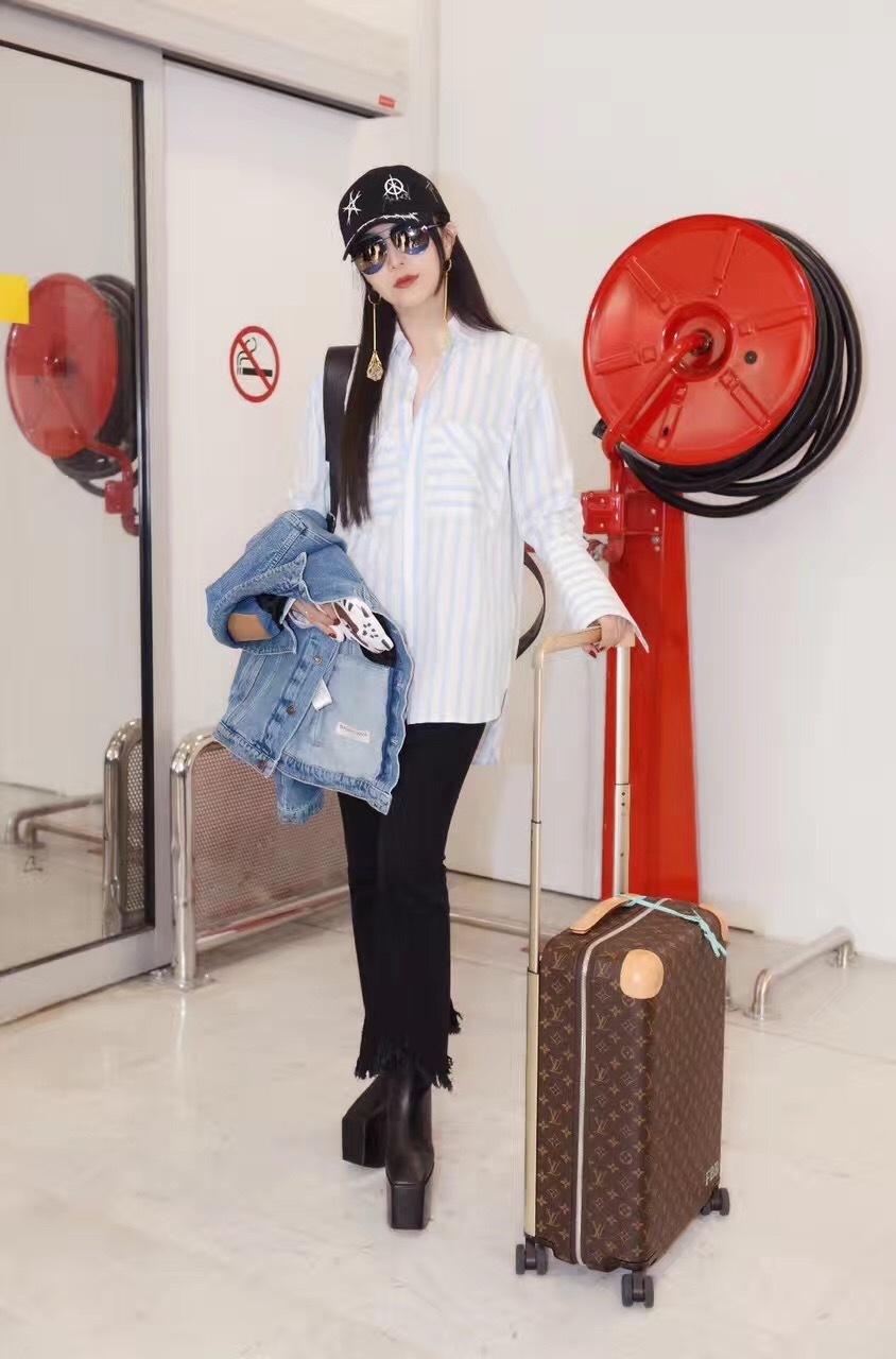 范冰冰身穿蓝色条纹衬衫、黑色牛仔喇叭裤,头戴黑色鸭舌帽,足登足有20厘米的“恨天高”,潮范儿十足。