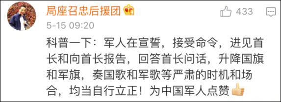 还有网友表示,不仅是中国军人,每一个普通的中国人升国旗奏国歌时,也都会自觉站立,因为这是从小就接受的教育。