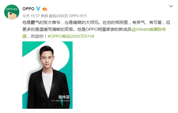 另外,OPPO R11代言人并不只有迪丽热巴,OPPO官方还表示,陈伟霆也将成为OPPO R11代言人。
