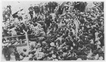 侥幸逃出下层舱室的人们不断聚集到顶层甲板上。更多的人在船体倾斜时掉进海水。不会游泳的很快溺水,即便会游泳,也有不少人被冻僵,沉入水中。还有一些人在冰冷的海水中挣扎着,被水流带着四散漂去。