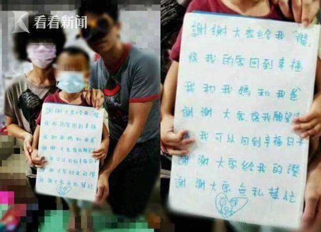 事后,该母亲又上传一张图片,是父母与男童的合照,这次男童手上仍持看板,上面改成写着:“谢谢大家给我赞!让我的家回到幸福,我和我妈和我爸谢谢大家无私帮忙。”