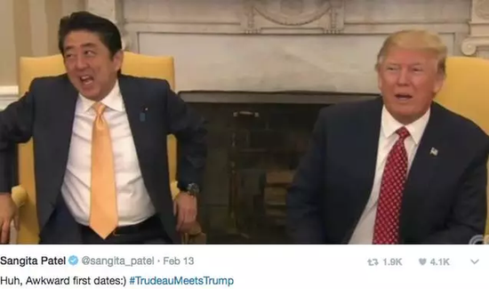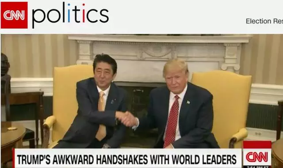 2017年2月9日到13日安倍访问美国,受到了美国总统特朗普的“热情”接待。他的热情主要体现在跟安倍的“肢体接触” ——握手。