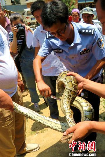图为胶农将缅甸蟒移交给当地林业局野生动物保护站工作人员 常宗波 摄