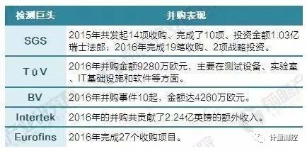 其他巨头也不例外,2016年TüV投资金额达9280万欧元,特别是在测试设备、实验室、IT基础设施和软件等方面;BV并购金额达4260万欧元;Intertek的收购贡献了2.24亿英镑的额外收入,还有Eurofins2016年完成27个收购项目...