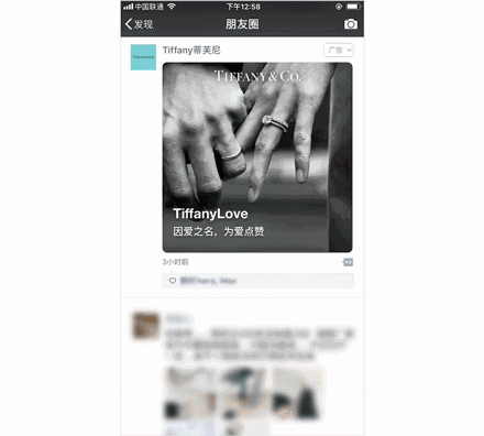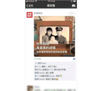 当然也少不了广告形状的创新。“幸福照相馆”中其实埋了一个“彩蛋”,也就是之前提到的点赞之后冤家圈广告会自动翻转,然后进入另外一个内容入口。现实上,这也是微信广告为春节打造的限时定制化广告形状。用户将微信晋级到最新版本,就有能够看到冤家圈翻转式卡片广告,“点赞”后,卡片即会呈现“翻转”,触发卡片反面。
