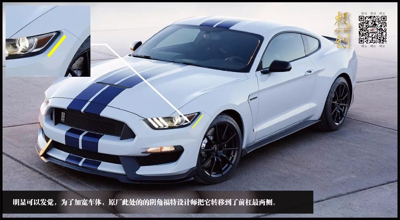 而原厂2.3T和GT在这个灯角处,外形和GT350有所不同更窄,还有个收起的弧线,这样才干在原厂没有加宽叶子板的状况下坚持吻合: