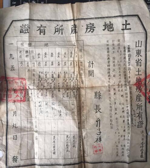 3月15日,记者看到了这张“山东省土地房产一切证”。该证近似正方形,边长37厘米左右。由于年代长远,纸张外表曾经泛黄,但字迹仍然明晰。这张土地房产一切证上的日期为1951年10月9日,下面盖有“昌乐县人民政府”的印章。整个文本均为繁体字印刷,外面的一些详细内容则用毛笔停止了填写。此外,还有事先的县长亓子祥的签字和印章。