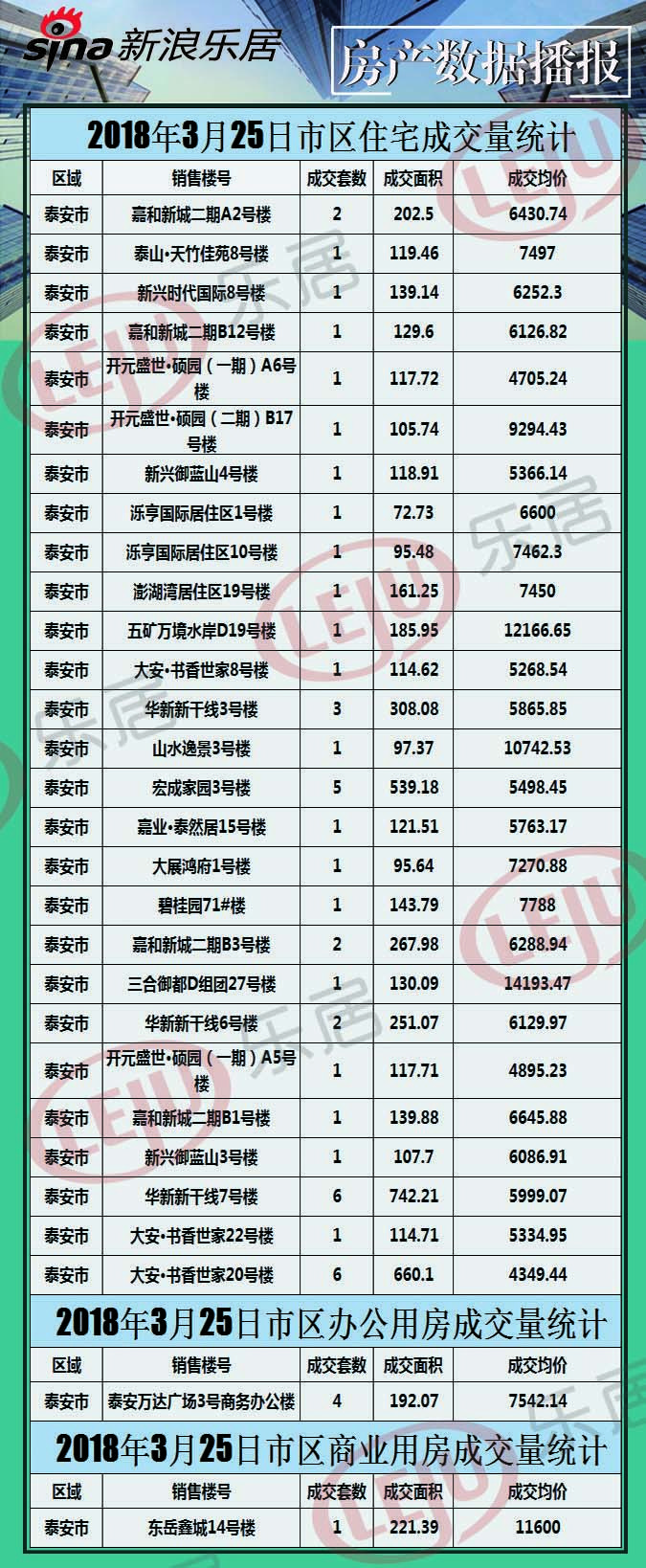 2018年3月25日泰安房产数据播报 小面积办公比赛受 • 作者:李龙远 • 2018年03月27日 • 国内新闻 据本站不完全统计,2018年3月25日泰安市共成交商品房51套,其中住宅网签66套,办公网签6套,商业网签6套,与3月24日相比(3月24日住宅成交66套,办公成交6套)环比下降29.17%,泰安楼市处于下降形态。华新新支线以互联网电子商务和移动商务聚集了全世界身经百战的最优秀的创业导师,汇集了全世界各国最优质的产业资源,召唤全球未来的商业领袖。消费渠道的普及,使得支付市场将在不久的将来继续呈现更加美好的增长前景。成交11套的业绩位居第一,成交面积在110-120之间,成交均价在5998元/左右。万达办公成交4套。成交面积在50左右,成交均价在7542.14元/左右,小面积办公比拟受喜欢。 推荐阅读 昨日收官,快手双11期间GMV较大促前增 京东五星电器11.11百款爆品家电五折起 全面布局,京东物流“亚洲一号”落地兰