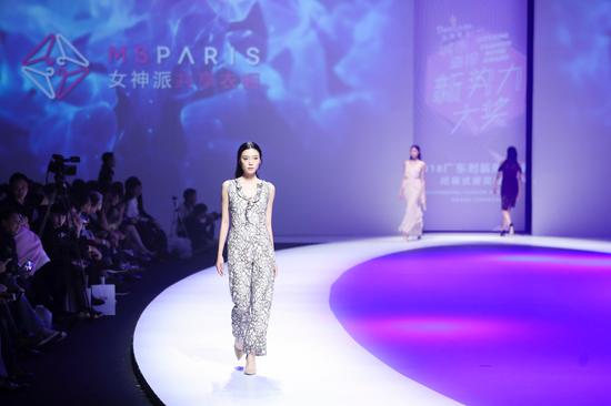 当灯光渐暗,身着华服的模特鱼贯而出,苗绣、香云纱、丝绸就成了舞台上熠熠发光的配角,在裙摆的舞动之间闪烁着诱人的光泽。这是由赵卉洲、金、邓兆萍、屈汀南、蔡中涵、林进亮和蔡蕾共七位首批“广东纺织服装非遗推行大使”带来的非遗主题收场大秀。他们运用非遗传统技艺或相关非遗文明元素设计非遗服装特征作品令人无比惊叹,绝妙地展现出“非遗”服装的精深工艺与时髦风采。