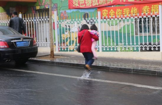 市场街上有一所幼儿园,由于门前路上积水很深,学校教师和送孩子的家长不得不涉水过河。
