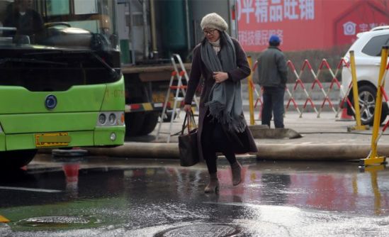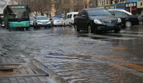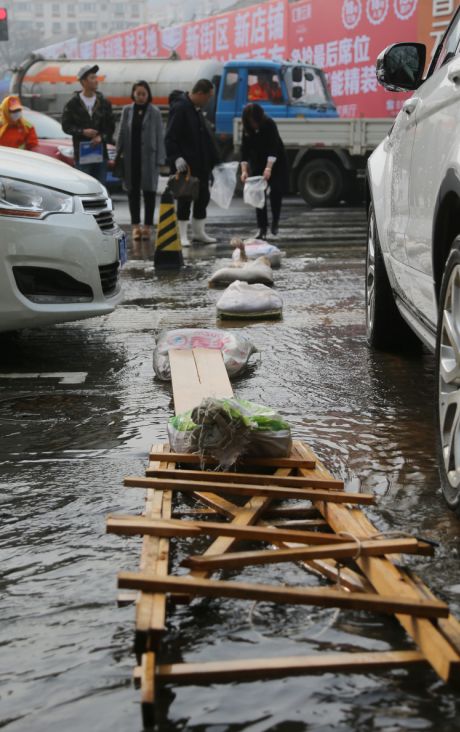 由于漏点“下游”的几条路上均水满为患,给市民的通行形成了极大的困扰。在365市民大楼门前处,任务人员在“河”里用沙袋和木板垫了一座“桥”,以便于市民通行,任务人员还预备了套脚塑料袋,方便市民过“河”。