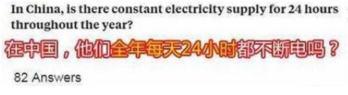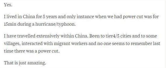 “是的。我在中国住了5年,在台风时期我们断电只要15分钟。我已经在中国普遍游览过。去过四五线的城市和一些村庄,和务工人员互动,似乎没有人记得上次停电的工夫。这太神奇了。”