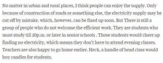 “无论在城乡,我都觉得人们能享用这个供给。只要由于修路或其他缘由,电力供给才能够会被错误地切断,但是,这很快就会被修复。但是有一群人不喜欢这么无效率的来电。他们是要学习到(早晨)十点或更晚的先生。 这些先生会由于没有电而感到快乐,这意味着他们不用上晚课, 教师也乐意早点回家。哎呀,班长会为先生买蜡烛。