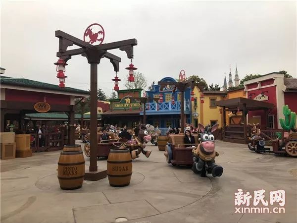 专为上海打造的胡迪牛仔嘉年华区域有11匹“公马”和11匹“母马”拉着游客驰骋,时而减速、时而转弯,非常安慰。游客似乎进入美国西部老镇之中。